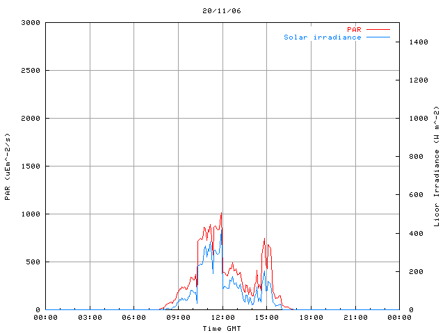 The PML meteorological station, situated on the south-west corner of the building roof, consists of a Hygroclip S3 temperature and humidity sensor housed in a radiation shield, a Mierij Meteo solid state wind sensor (MMW-005), a Chelsea instruments half-hemisphere PAR sensor, a Li-Cor pyranometer (LI-200SZ) and an Omni Instruments 6" tipping bucket raingauge (RG200). The data are logged every 5 minutes using a Pace Scientific XR5 data logger. The real-time rainfall data is likely in error - the correct values will be displayed after a time lag of approximately 24 hours. The meteorological station is sheltered from winds in the north-east and underestimates winds from this quarter. To use these data please contact Dr Tim Smyth.