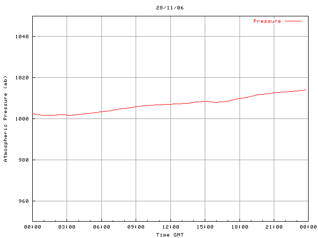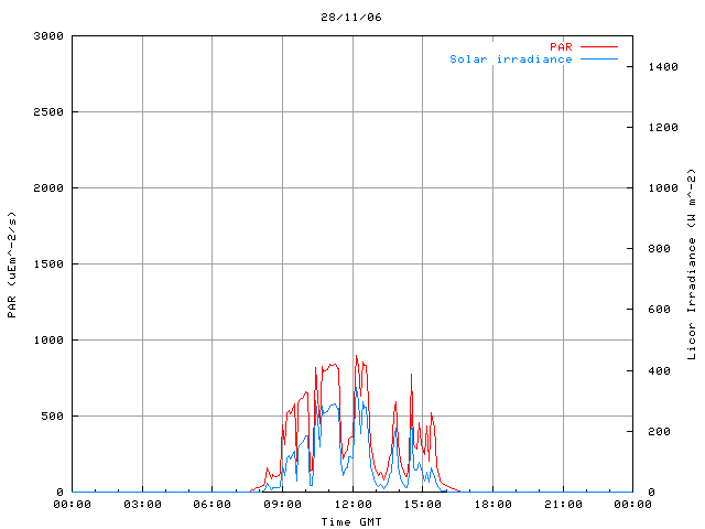The PML meteorological station, situated on the south-west corner of the building roof, consists of a Hygroclip S3 temperature and humidity sensor housed in a radiation shield, a Mierij Meteo solid state wind sensor (MMW-005), a Chelsea instruments half-hemisphere PAR sensor, a Li-Cor pyranometer (LI-200SZ) and an Omni Instruments 6" tipping bucket raingauge (RG200). The data are logged every 5 minutes using a Pace Scientific XR5 data logger. The real-time rainfall data is likely in error - the correct values will be displayed after a time lag of approximately 24 hours. The meteorological station is sheltered from winds in the north-east and underestimates winds from this quarter. To use these data please contact Dr Tim Smyth.