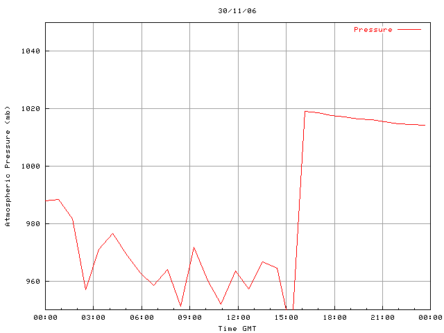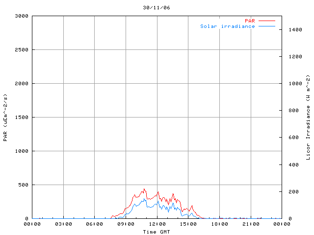 The PML meteorological station, situated on the south-west corner of the building roof, consists of a Hygroclip S3 temperature and humidity sensor housed in a radiation shield, a Mierij Meteo solid state wind sensor (MMW-005), a Chelsea instruments half-hemisphere PAR sensor, a Li-Cor pyranometer (LI-200SZ) and an Omni Instruments 6" tipping bucket raingauge (RG200). The data are logged every 5 minutes using a Pace Scientific XR5 data logger. The real-time rainfall data is likely in error - the correct values will be displayed after a time lag of approximately 24 hours. The meteorological station is sheltered from winds in the north-east and underestimates winds from this quarter. To use these data please contact Dr Tim Smyth.
