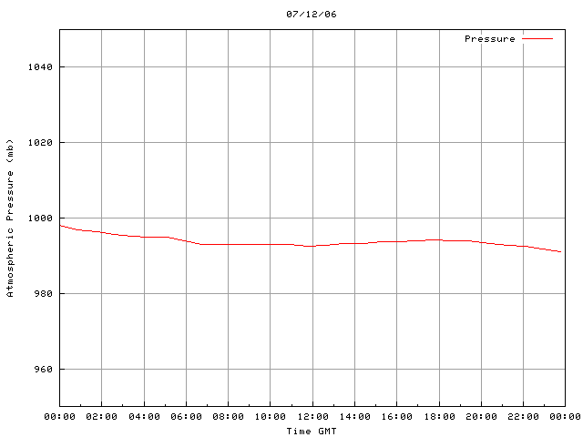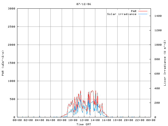 The PML meteorological station, situated on the south-west corner of the building roof, consists of a Hygroclip S3 temperature and humidity sensor housed in a radiation shield, a Mierij Meteo solid state wind sensor (MMW-005), a Chelsea instruments half-hemisphere PAR sensor, a Li-Cor pyranometer (LI-200SZ) and an Omni Instruments 6" tipping bucket raingauge (RG200). The data are logged every 5 minutes using a Pace Scientific XR5 data logger. The real-time rainfall data is likely in error - the correct values will be displayed after a time lag of approximately 24 hours. The meteorological station is sheltered from winds in the north-east and underestimates winds from this quarter. To use these data please contact Dr Tim Smyth.