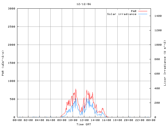 The PML meteorological station, situated on the south-west corner of the building roof, consists of a Hygroclip S3 temperature and humidity sensor housed in a radiation shield, a Mierij Meteo solid state wind sensor (MMW-005), a Chelsea instruments half-hemisphere PAR sensor, a Li-Cor pyranometer (LI-200SZ) and an Omni Instruments 6" tipping bucket raingauge (RG200). The data are logged every 5 minutes using a Pace Scientific XR5 data logger. The real-time rainfall data is likely in error - the correct values will be displayed after a time lag of approximately 24 hours. The meteorological station is sheltered from winds in the north-east and underestimates winds from this quarter. To use these data please contact Dr Tim Smyth.