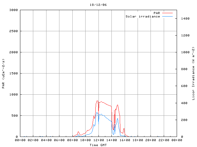 The PML meteorological station, situated on the south-west corner of the building roof, consists of a Hygroclip S3 temperature and humidity sensor housed in a radiation shield, a Mierij Meteo solid state wind sensor (MMW-005), a Chelsea instruments half-hemisphere PAR sensor, a Li-Cor pyranometer (LI-200SZ) and an Omni Instruments 6" tipping bucket raingauge (RG200). The data are logged every 5 minutes using a Pace Scientific XR5 data logger. The real-time rainfall data is likely in error - the correct values will be displayed after a time lag of approximately 24 hours. The meteorological station is sheltered from winds in the north-east and underestimates winds from this quarter. To use these data please contact Dr Tim Smyth.