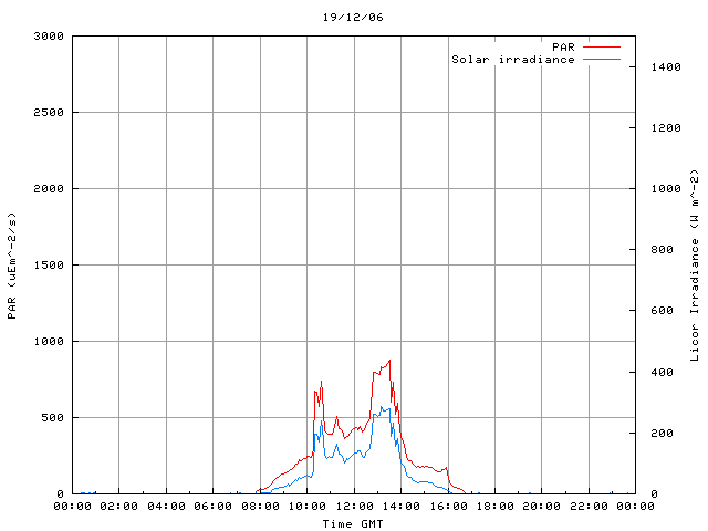 The PML meteorological station, situated on the south-west corner of the building roof, consists of a Hygroclip S3 temperature and humidity sensor housed in a radiation shield, a Mierij Meteo solid state wind sensor (MMW-005), a Chelsea instruments half-hemisphere PAR sensor, a Li-Cor pyranometer (LI-200SZ) and an Omni Instruments 6" tipping bucket raingauge (RG200). The data are logged every 5 minutes using a Pace Scientific XR5 data logger. The real-time rainfall data is likely in error - the correct values will be displayed after a time lag of approximately 24 hours. The meteorological station is sheltered from winds in the north-east and underestimates winds from this quarter. To use these data please contact Dr Tim Smyth.