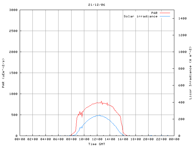 The PML meteorological station, situated on the south-west corner of the building roof, consists of a Hygroclip S3 temperature and humidity sensor housed in a radiation shield, a Mierij Meteo solid state wind sensor (MMW-005), a Chelsea instruments half-hemisphere PAR sensor, a Li-Cor pyranometer (LI-200SZ) and an Omni Instruments 6" tipping bucket raingauge (RG200). The data are logged every 5 minutes using a Pace Scientific XR5 data logger. The real-time rainfall data is likely in error - the correct values will be displayed after a time lag of approximately 24 hours. The meteorological station is sheltered from winds in the north-east and underestimates winds from this quarter. To use these data please contact Dr Tim Smyth.