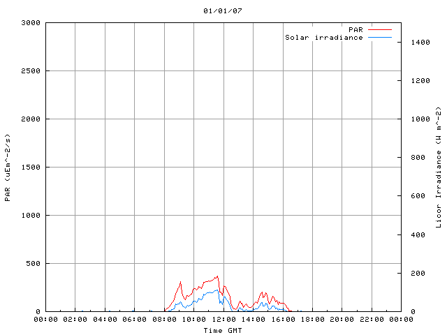 The PML meteorological station, situated on the south-west corner of the building roof, consists of a Hygroclip S3 temperature and humidity sensor housed in a radiation shield, a Mierij Meteo solid state wind sensor (MMW-005), a Chelsea instruments half-hemisphere PAR sensor, a Li-Cor pyranometer (LI-200SZ) and an Omni Instruments 6" tipping bucket raingauge (RG200). The data are logged every 5 minutes using a Pace Scientific XR5 data logger. The real-time rainfall data is likely in error - the correct values will be displayed after a time lag of approximately 24 hours. The meteorological station is sheltered from winds in the north-east and underestimates winds from this quarter. To use these data please contact Dr Tim Smyth.