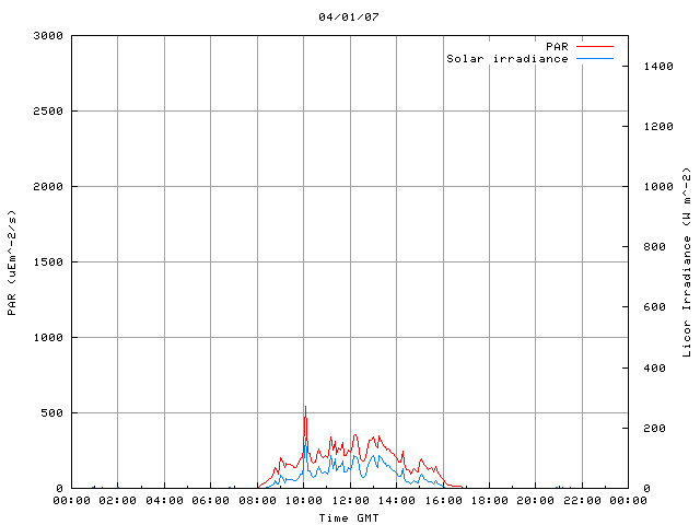 The PML meteorological station, situated on the south-west corner of the building roof, consists of a Hygroclip S3 temperature and humidity sensor housed in a radiation shield, a Mierij Meteo solid state wind sensor (MMW-005), a Chelsea instruments half-hemisphere PAR sensor, a Li-Cor pyranometer (LI-200SZ) and an Omni Instruments 6" tipping bucket raingauge (RG200). The data are logged every 5 minutes using a Pace Scientific XR5 data logger. The real-time rainfall data is likely in error - the correct values will be displayed after a time lag of approximately 24 hours. The meteorological station is sheltered from winds in the north-east and underestimates winds from this quarter. To use these data please contact Dr Tim Smyth.