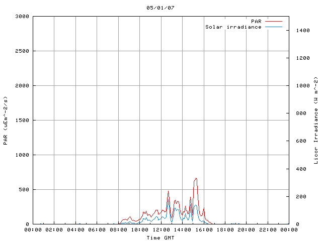 The PML meteorological station, situated on the south-west corner of the building roof, consists of a Hygroclip S3 temperature and humidity sensor housed in a radiation shield, a Mierij Meteo solid state wind sensor (MMW-005), a Chelsea instruments half-hemisphere PAR sensor, a Li-Cor pyranometer (LI-200SZ) and an Omni Instruments 6" tipping bucket raingauge (RG200). The data are logged every 5 minutes using a Pace Scientific XR5 data logger. The real-time rainfall data is likely in error - the correct values will be displayed after a time lag of approximately 24 hours. The meteorological station is sheltered from winds in the north-east and underestimates winds from this quarter. To use these data please contact Dr Tim Smyth.