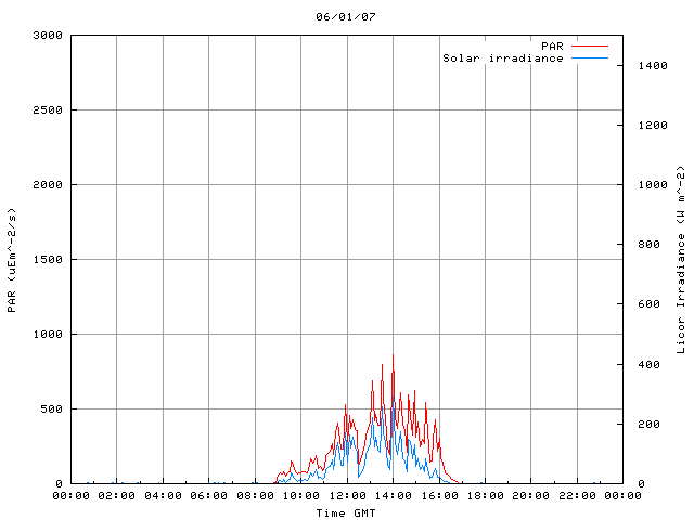 The PML meteorological station, situated on the south-west corner of the building roof, consists of a Hygroclip S3 temperature and humidity sensor housed in a radiation shield, a Mierij Meteo solid state wind sensor (MMW-005), a Chelsea instruments half-hemisphere PAR sensor, a Li-Cor pyranometer (LI-200SZ) and an Omni Instruments 6" tipping bucket raingauge (RG200). The data are logged every 5 minutes using a Pace Scientific XR5 data logger. The real-time rainfall data is likely in error - the correct values will be displayed after a time lag of approximately 24 hours. The meteorological station is sheltered from winds in the north-east and underestimates winds from this quarter. To use these data please contact Dr Tim Smyth.