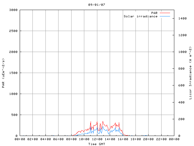 The PML meteorological station, situated on the south-west corner of the building roof, consists of a Hygroclip S3 temperature and humidity sensor housed in a radiation shield, a Mierij Meteo solid state wind sensor (MMW-005), a Chelsea instruments half-hemisphere PAR sensor, a Li-Cor pyranometer (LI-200SZ) and an Omni Instruments 6" tipping bucket raingauge (RG200). The data are logged every 5 minutes using a Pace Scientific XR5 data logger. The real-time rainfall data is likely in error - the correct values will be displayed after a time lag of approximately 24 hours. The meteorological station is sheltered from winds in the north-east and underestimates winds from this quarter. To use these data please contact Dr Tim Smyth.