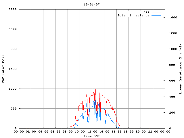 The PML meteorological station, situated on the south-west corner of the building roof, consists of a Hygroclip S3 temperature and humidity sensor housed in a radiation shield, a Mierij Meteo solid state wind sensor (MMW-005), a Chelsea instruments half-hemisphere PAR sensor, a Li-Cor pyranometer (LI-200SZ) and an Omni Instruments 6" tipping bucket raingauge (RG200). The data are logged every 5 minutes using a Pace Scientific XR5 data logger. The real-time rainfall data is likely in error - the correct values will be displayed after a time lag of approximately 24 hours. The meteorological station is sheltered from winds in the north-east and underestimates winds from this quarter. To use these data please contact Dr Tim Smyth.