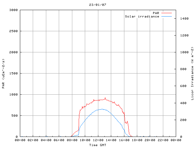 The PML meteorological station, situated on the south-west corner of the building roof, consists of a Hygroclip S3 temperature and humidity sensor housed in a radiation shield, a Mierij Meteo solid state wind sensor (MMW-005), a Chelsea instruments half-hemisphere PAR sensor, a Li-Cor pyranometer (LI-200SZ) and an Omni Instruments 6" tipping bucket raingauge (RG200). The data are logged every 5 minutes using a Pace Scientific XR5 data logger. The real-time rainfall data is likely in error - the correct values will be displayed after a time lag of approximately 24 hours. The meteorological station is sheltered from winds in the north-east and underestimates winds from this quarter. To use these data please contact Dr Tim Smyth.