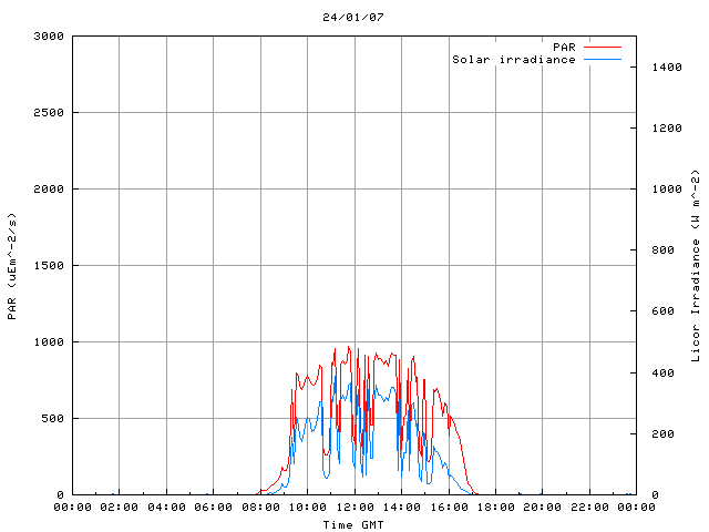 The PML meteorological station, situated on the south-west corner of the building roof, consists of a Hygroclip S3 temperature and humidity sensor housed in a radiation shield, a Mierij Meteo solid state wind sensor (MMW-005), a Chelsea instruments half-hemisphere PAR sensor, a Li-Cor pyranometer (LI-200SZ) and an Omni Instruments 6" tipping bucket raingauge (RG200). The data are logged every 5 minutes using a Pace Scientific XR5 data logger. The real-time rainfall data is likely in error - the correct values will be displayed after a time lag of approximately 24 hours. The meteorological station is sheltered from winds in the north-east and underestimates winds from this quarter. To use these data please contact Dr Tim Smyth.