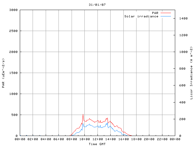 The PML meteorological station, situated on the south-west corner of the building roof, consists of a Hygroclip S3 temperature and humidity sensor housed in a radiation shield, a Mierij Meteo solid state wind sensor (MMW-005), a Chelsea instruments half-hemisphere PAR sensor, a Li-Cor pyranometer (LI-200SZ) and an Omni Instruments 6" tipping bucket raingauge (RG200). The data are logged every 5 minutes using a Pace Scientific XR5 data logger. The real-time rainfall data is likely in error - the correct values will be displayed after a time lag of approximately 24 hours. The meteorological station is sheltered from winds in the north-east and underestimates winds from this quarter. To use these data please contact Dr Tim Smyth.