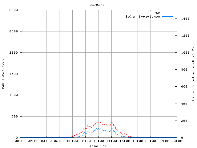 The PML meteorological station, situated on the south-west corner of the building roof, consists of a Hygroclip S3 temperature and humidity sensor housed in a radiation shield, a Mierij Meteo solid state wind sensor (MMW-005), a Chelsea instruments half-hemisphere PAR sensor, a Li-Cor pyranometer (LI-200SZ) and an Omni Instruments 6" tipping bucket raingauge (RG200). The data are logged every 5 minutes using a Pace Scientific XR5 data logger. The real-time rainfall data is likely in error - the correct values will be displayed after a time lag of approximately 24 hours. The meteorological station is sheltered from winds in the north-east and underestimates winds from this quarter. To use these data please contact Dr Tim Smyth.