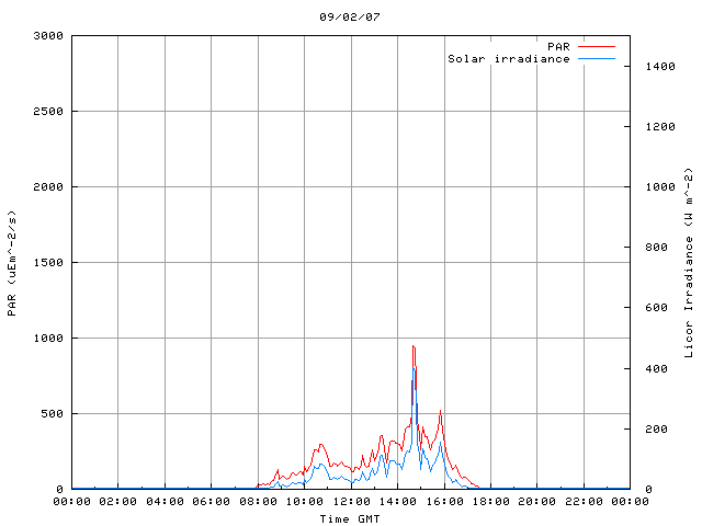 The PML meteorological station, situated on the south-west corner of the building roof, consists of a Hygroclip S3 temperature and humidity sensor housed in a radiation shield, a Mierij Meteo solid state wind sensor (MMW-005), a Chelsea instruments half-hemisphere PAR sensor, a Li-Cor pyranometer (LI-200SZ) and an Omni Instruments 6" tipping bucket raingauge (RG200). The data are logged every 5 minutes using a Pace Scientific XR5 data logger. The real-time rainfall data is likely in error - the correct values will be displayed after a time lag of approximately 24 hours. The meteorological station is sheltered from winds in the north-east and underestimates winds from this quarter. To use these data please contact Dr Tim Smyth.
