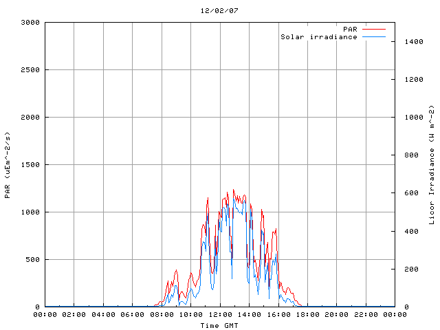 The PML meteorological station, situated on the south-west corner of the building roof, consists of a Hygroclip S3 temperature and humidity sensor housed in a radiation shield, a Mierij Meteo solid state wind sensor (MMW-005), a Chelsea instruments half-hemisphere PAR sensor, a Li-Cor pyranometer (LI-200SZ) and an Omni Instruments 6" tipping bucket raingauge (RG200). The data are logged every 5 minutes using a Pace Scientific XR5 data logger. The real-time rainfall data is likely in error - the correct values will be displayed after a time lag of approximately 24 hours. The meteorological station is sheltered from winds in the north-east and underestimates winds from this quarter. To use these data please contact Dr Tim Smyth.