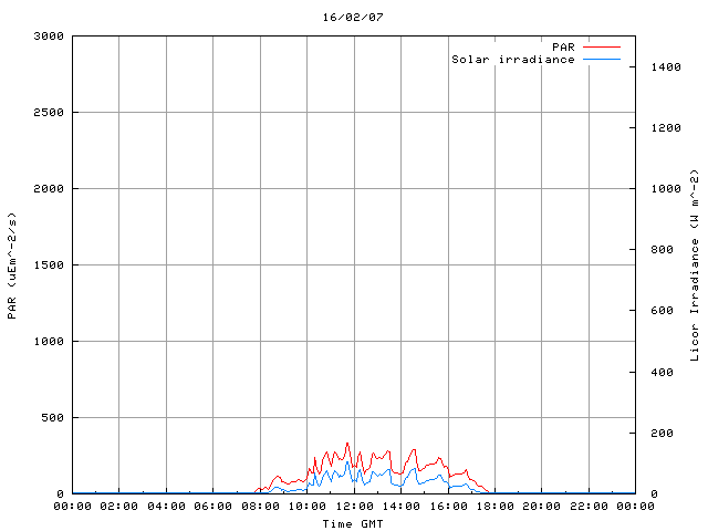 The PML meteorological station, situated on the south-west corner of the building roof, consists of a Hygroclip S3 temperature and humidity sensor housed in a radiation shield, a Mierij Meteo solid state wind sensor (MMW-005), a Chelsea instruments half-hemisphere PAR sensor, a Li-Cor pyranometer (LI-200SZ) and an Omni Instruments 6" tipping bucket raingauge (RG200). The data are logged every 5 minutes using a Pace Scientific XR5 data logger. The real-time rainfall data is likely in error - the correct values will be displayed after a time lag of approximately 24 hours. The meteorological station is sheltered from winds in the north-east and underestimates winds from this quarter. To use these data please contact Dr Tim Smyth.