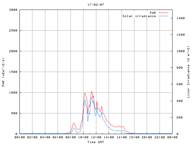 The PML meteorological station, situated on the south-west corner of the building roof, consists of a Hygroclip S3 temperature and humidity sensor housed in a radiation shield, a Mierij Meteo solid state wind sensor (MMW-005), a Chelsea instruments half-hemisphere PAR sensor, a Li-Cor pyranometer (LI-200SZ) and an Omni Instruments 6" tipping bucket raingauge (RG200). The data are logged every 5 minutes using a Pace Scientific XR5 data logger. The real-time rainfall data is likely in error - the correct values will be displayed after a time lag of approximately 24 hours. The meteorological station is sheltered from winds in the north-east and underestimates winds from this quarter. To use these data please contact Dr Tim Smyth.