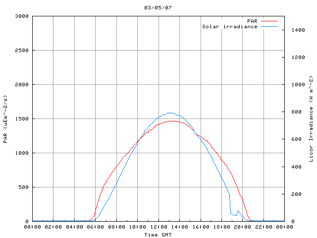 The PML meteorological station, situated on the south-west corner of the building roof, consists of a Hygroclip S3 temperature and humidity sensor housed in a radiation shield, a Mierij Meteo solid state wind sensor (MMW-005), a Chelsea instruments half-hemisphere PAR sensor, a Li-Cor pyranometer (LI-200SZ) and an Omni Instruments 6" tipping bucket raingauge (RG200). The data are logged every 5 minutes using a Pace Scientific XR5 data logger. The real-time rainfall data is likely in error - the correct values will be displayed after a time lag of approximately 24 hours. The meteorological station is sheltered from winds in the north-east and underestimates winds from this quarter. To use these data please contact Dr Tim Smyth.