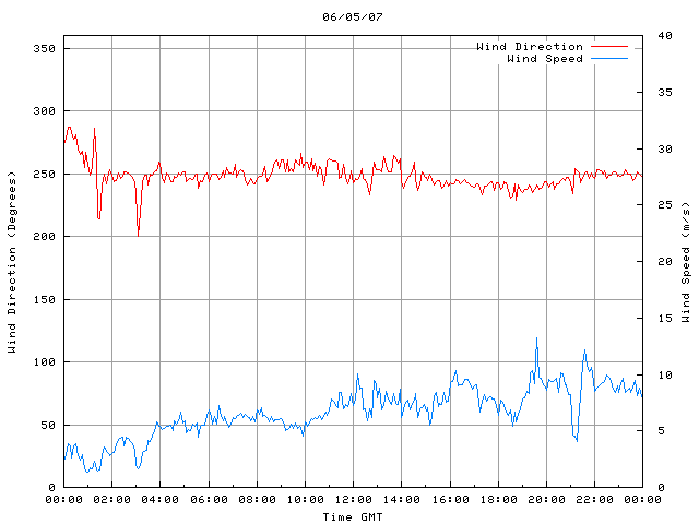 - Max Wind Speed: 13.2 ms-1 Time: 19:35:17 GMT