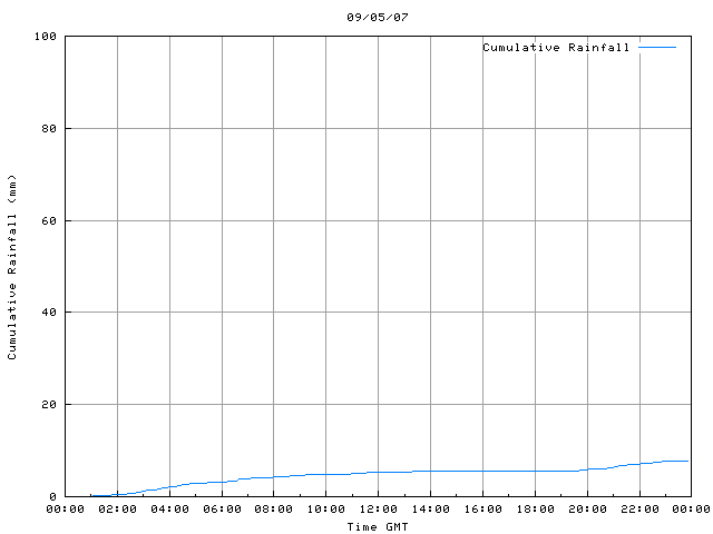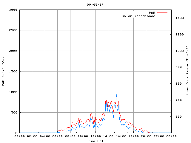 The PML meteorological station, situated on the south-west corner of the building roof, consists of a Hygroclip S3 temperature and humidity sensor housed in a radiation shield, a Mierij Meteo solid state wind sensor (MMW-005), a Chelsea instruments half-hemisphere PAR sensor, a Li-Cor pyranometer (LI-200SZ) and an Omni Instruments 6" tipping bucket raingauge (RG200). The data are logged every 5 minutes using a Pace Scientific XR5 data logger. The real-time rainfall data is likely in error - the correct values will be displayed after a time lag of approximately 24 hours. The meteorological station is sheltered from winds in the north-east and underestimates winds from this quarter. To use these data please contact Dr Tim Smyth.