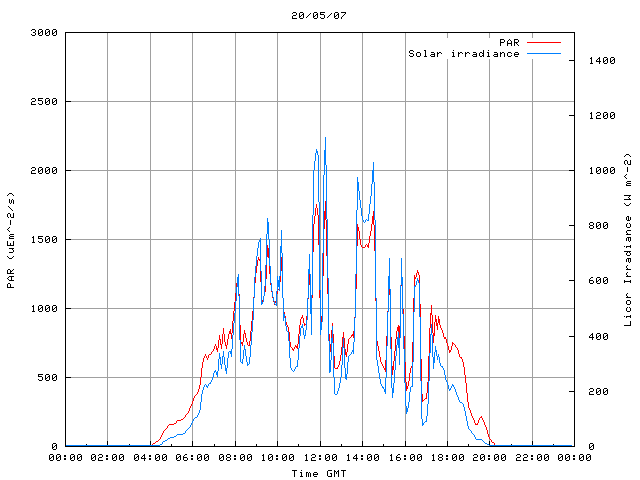 The PML meteorological station, situated on the south-west corner of the building roof, consists of a Hygroclip S3 temperature and humidity sensor housed in a radiation shield, a Mierij Meteo solid state wind sensor (MMW-005), a Chelsea instruments half-hemisphere PAR sensor, a Li-Cor pyranometer (LI-200SZ) and an Omni Instruments 6" tipping bucket raingauge (RG200). The data are logged every 5 minutes using a Pace Scientific XR5 data logger. The real-time rainfall data is likely in error - the correct values will be displayed after a time lag of approximately 24 hours. The meteorological station is sheltered from winds in the north-east and underestimates winds from this quarter. To use these data please contact Dr Tim Smyth.