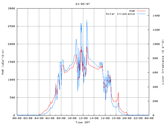 The PML meteorological station, situated on the south-west corner of the building roof, consists of a Hygroclip S3 temperature and humidity sensor housed in a radiation shield, a Mierij Meteo solid state wind sensor (MMW-005), a Chelsea instruments half-hemisphere PAR sensor, a Li-Cor pyranometer (LI-200SZ) and an Omni Instruments 6" tipping bucket raingauge (RG200). The data are logged every 5 minutes using a Pace Scientific XR5 data logger. The real-time rainfall data is likely in error - the correct values will be displayed after a time lag of approximately 24 hours. The meteorological station is sheltered from winds in the north-east and underestimates winds from this quarter. To use these data please contact Dr Tim Smyth.