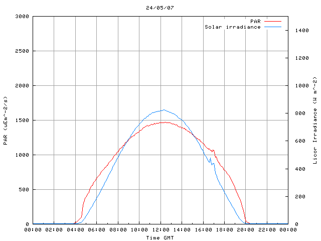 The PML meteorological station, situated on the south-west corner of the building roof, consists of a Hygroclip S3 temperature and humidity sensor housed in a radiation shield, a Mierij Meteo solid state wind sensor (MMW-005), a Chelsea instruments half-hemisphere PAR sensor, a Li-Cor pyranometer (LI-200SZ) and an Omni Instruments 6" tipping bucket raingauge (RG200). The data are logged every 5 minutes using a Pace Scientific XR5 data logger. The real-time rainfall data is likely in error - the correct values will be displayed after a time lag of approximately 24 hours. The meteorological station is sheltered from winds in the north-east and underestimates winds from this quarter. To use these data please contact Dr Tim Smyth.