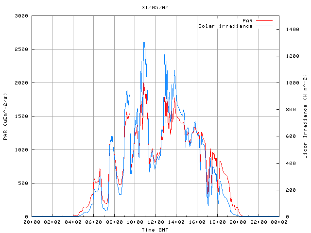 The PML meteorological station, situated on the south-west corner of the building roof, consists of a Hygroclip S3 temperature and humidity sensor housed in a radiation shield, a Mierij Meteo solid state wind sensor (MMW-005), a Chelsea instruments half-hemisphere PAR sensor, a Li-Cor pyranometer (LI-200SZ) and an Omni Instruments 6" tipping bucket raingauge (RG200). The data are logged every 5 minutes using a Pace Scientific XR5 data logger. The real-time rainfall data is likely in error - the correct values will be displayed after a time lag of approximately 24 hours. The meteorological station is sheltered from winds in the north-east and underestimates winds from this quarter. To use these data please contact Dr Tim Smyth.