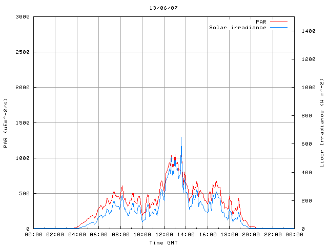 The PML meteorological station, situated on the south-west corner of the building roof, consists of a Hygroclip S3 temperature and humidity sensor housed in a radiation shield, a Mierij Meteo solid state wind sensor (MMW-005), a Chelsea instruments half-hemisphere PAR sensor, a Li-Cor pyranometer (LI-200SZ) and an Omni Instruments 6" tipping bucket raingauge (RG200). The data are logged every 5 minutes using a Pace Scientific XR5 data logger. The real-time rainfall data is likely in error - the correct values will be displayed after a time lag of approximately 24 hours. The meteorological station is sheltered from winds in the north-east and underestimates winds from this quarter. To use these data please contact Dr Tim Smyth.