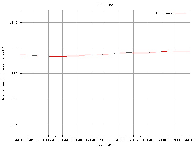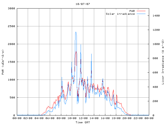 The PML meteorological station, situated on the south-west corner of the building roof, consists of a Hygroclip S3 temperature and humidity sensor housed in a radiation shield, a Mierij Meteo solid state wind sensor (MMW-005), a Chelsea instruments half-hemisphere PAR sensor, a Li-Cor pyranometer (LI-200SZ) and an Omni Instruments 6" tipping bucket raingauge (RG200). The data are logged every 5 minutes using a Pace Scientific XR5 data logger. The real-time rainfall data is likely in error - the correct values will be displayed after a time lag of approximately 24 hours. The meteorological station is sheltered from winds in the north-east and underestimates winds from this quarter. To use these data please contact Dr Tim Smyth.