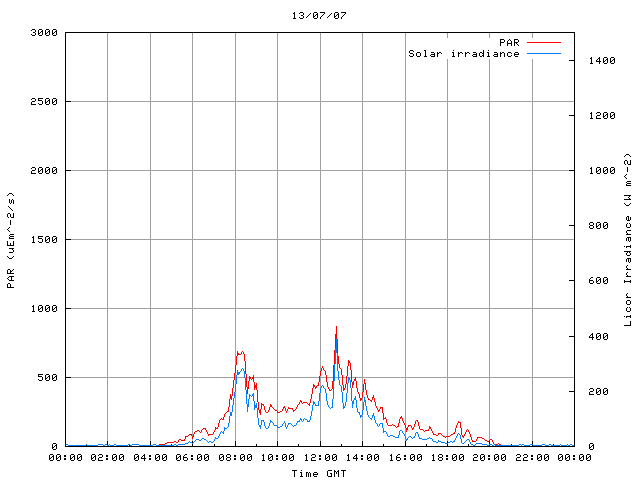The PML meteorological station, situated on the south-west corner of the building roof, consists of a Hygroclip S3 temperature and humidity sensor housed in a radiation shield, a Mierij Meteo solid state wind sensor (MMW-005), a Chelsea instruments half-hemisphere PAR sensor, a Li-Cor pyranometer (LI-200SZ) and an Omni Instruments 6" tipping bucket raingauge (RG200). The data are logged every 5 minutes using a Pace Scientific XR5 data logger. The real-time rainfall data is likely in error - the correct values will be displayed after a time lag of approximately 24 hours. The meteorological station is sheltered from winds in the north-east and underestimates winds from this quarter. To use these data please contact Dr Tim Smyth.