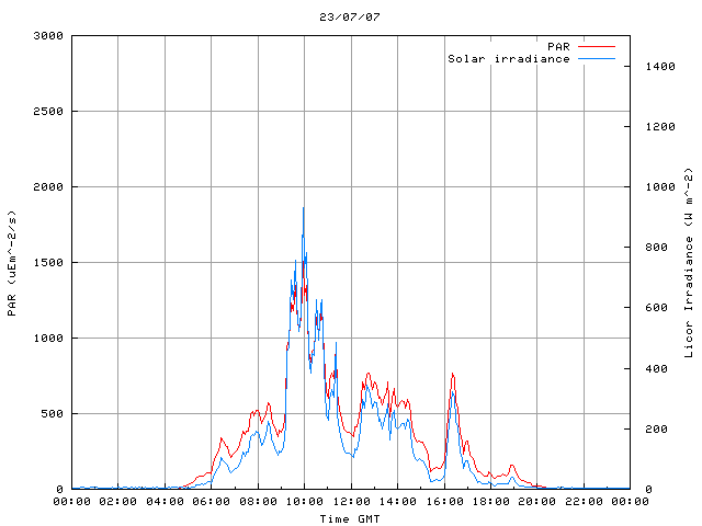 The PML meteorological station, situated on the south-west corner of the building roof, consists of a Hygroclip S3 temperature and humidity sensor housed in a radiation shield, a Mierij Meteo solid state wind sensor (MMW-005), a Chelsea instruments half-hemisphere PAR sensor, a Li-Cor pyranometer (LI-200SZ) and an Omni Instruments 6" tipping bucket raingauge (RG200). The data are logged every 5 minutes using a Pace Scientific XR5 data logger. The real-time rainfall data is likely in error - the correct values will be displayed after a time lag of approximately 24 hours. The meteorological station is sheltered from winds in the north-east and underestimates winds from this quarter. To use these data please contact Dr Tim Smyth.