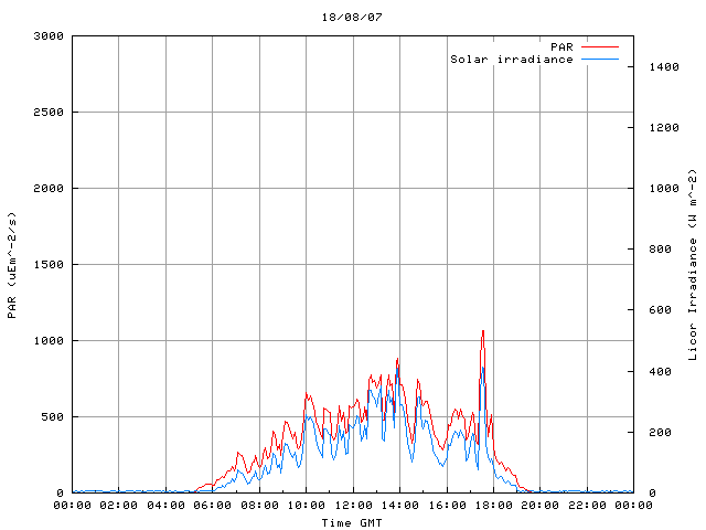 The PML meteorological station, situated on the south-west corner of the building roof, consists of a Hygroclip S3 temperature and humidity sensor housed in a radiation shield, a Mierij Meteo solid state wind sensor (MMW-005), a Chelsea instruments half-hemisphere PAR sensor, a Li-Cor pyranometer (LI-200SZ) and an Omni Instruments 6" tipping bucket raingauge (RG200). The data are logged every 5 minutes using a Pace Scientific XR5 data logger. The real-time rainfall data is likely in error - the correct values will be displayed after a time lag of approximately 24 hours. The meteorological station is sheltered from winds in the north-east and underestimates winds from this quarter. To use these data please contact Dr Tim Smyth.