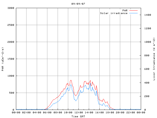 The PML meteorological station, situated on the south-west corner of the building roof, consists of a Hygroclip S3 temperature and humidity sensor housed in a radiation shield, a Mierij Meteo solid state wind sensor (MMW-005), a Chelsea instruments half-hemisphere PAR sensor, a Li-Cor pyranometer (LI-200SZ) and an Omni Instruments 6" tipping bucket raingauge (RG200). The data are logged every 5 minutes using a Pace Scientific XR5 data logger. The real-time rainfall data is likely in error - the correct values will be displayed after a time lag of approximately 24 hours. The meteorological station is sheltered from winds in the north-east and underestimates winds from this quarter. To use these data please contact Dr Tim Smyth.