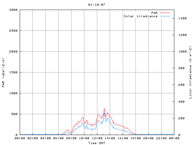 The PML meteorological station, situated on the south-west corner of the building roof, consists of a Hygroclip S3 temperature and humidity sensor housed in a radiation shield, a Mierij Meteo solid state wind sensor (MMW-005), a Chelsea instruments half-hemisphere PAR sensor, a Li-Cor pyranometer (LI-200SZ) and an Omni Instruments 6" tipping bucket raingauge (RG200). The data are logged every 5 minutes using a Pace Scientific XR5 data logger. The real-time rainfall data is likely in error - the correct values will be displayed after a time lag of approximately 24 hours. The meteorological station is sheltered from winds in the north-east and underestimates winds from this quarter. To use these data please contact Dr Tim Smyth.
