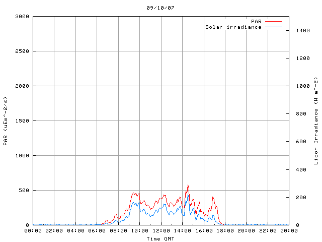 The PML meteorological station, situated on the south-west corner of the building roof, consists of a Hygroclip S3 temperature and humidity sensor housed in a radiation shield, a Mierij Meteo solid state wind sensor (MMW-005), a Chelsea instruments half-hemisphere PAR sensor, a Li-Cor pyranometer (LI-200SZ) and an Omni Instruments 6" tipping bucket raingauge (RG200). The data are logged every 5 minutes using a Pace Scientific XR5 data logger. The real-time rainfall data is likely in error - the correct values will be displayed after a time lag of approximately 24 hours. The meteorological station is sheltered from winds in the north-east and underestimates winds from this quarter. To use these data please contact Dr Tim Smyth.