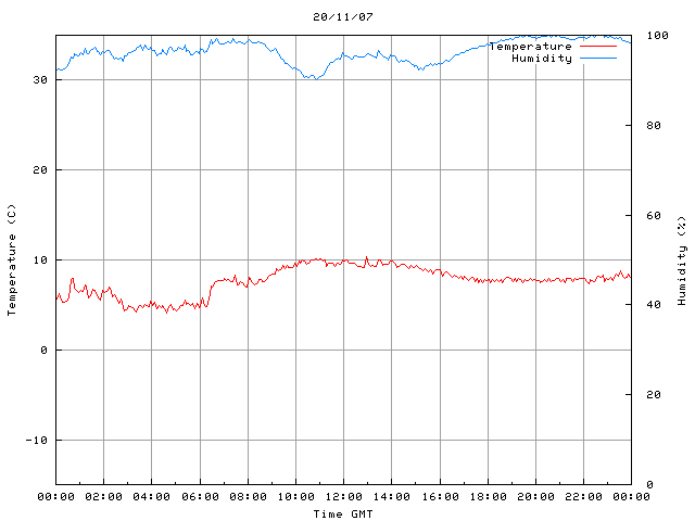 The PML meteorological station, situated on the south-west corner of the building roof, consists of a Hygroclip S3 temperature and humidity sensor housed in a radiation shield, a Mierij Meteo solid state wind sensor (MMW-005), a Chelsea instruments half-hemisphere PAR sensor, a Li-Cor pyranometer (LI-200SZ) and an Omni Instruments 6" tipping bucket raingauge (RG200). The data are logged every 5 minutes using a Pace Scientific XR5 data logger. The real-time rainfall data is likely in error - the correct values will be displayed after a time lag of approximately 24 hours. The meteorological station is sheltered from winds in the north-east and underestimates winds from this quarter. To use these data please contact Dr Tim Smyth.