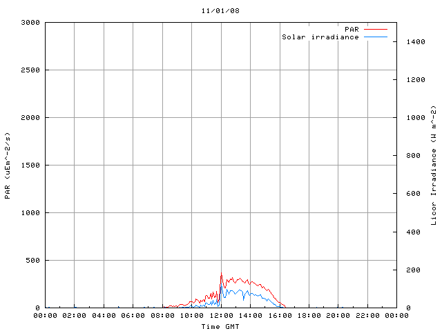 The PML meteorological station, situated on the south-west corner of the building roof, consists of a Hygroclip S3 temperature and humidity sensor housed in a radiation shield, a Mierij Meteo solid state wind sensor (MMW-005), a Chelsea instruments half-hemisphere PAR sensor, a Li-Cor pyranometer (LI-200SZ) and an Omni Instruments 6" tipping bucket raingauge (RG200). The data are logged every 5 minutes using a Pace Scientific XR5 data logger. The real-time rainfall data is likely in error - the correct values will be displayed after a time lag of approximately 24 hours. The meteorological station is sheltered from winds in the north-east and underestimates winds from this quarter. To use these data please contact Dr Tim Smyth.