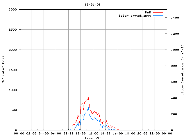 The PML meteorological station, situated on the south-west corner of the building roof, consists of a Hygroclip S3 temperature and humidity sensor housed in a radiation shield, a Mierij Meteo solid state wind sensor (MMW-005), a Chelsea instruments half-hemisphere PAR sensor, a Li-Cor pyranometer (LI-200SZ) and an Omni Instruments 6" tipping bucket raingauge (RG200). The data are logged every 5 minutes using a Pace Scientific XR5 data logger. The real-time rainfall data is likely in error - the correct values will be displayed after a time lag of approximately 24 hours. The meteorological station is sheltered from winds in the north-east and underestimates winds from this quarter. To use these data please contact Dr Tim Smyth.