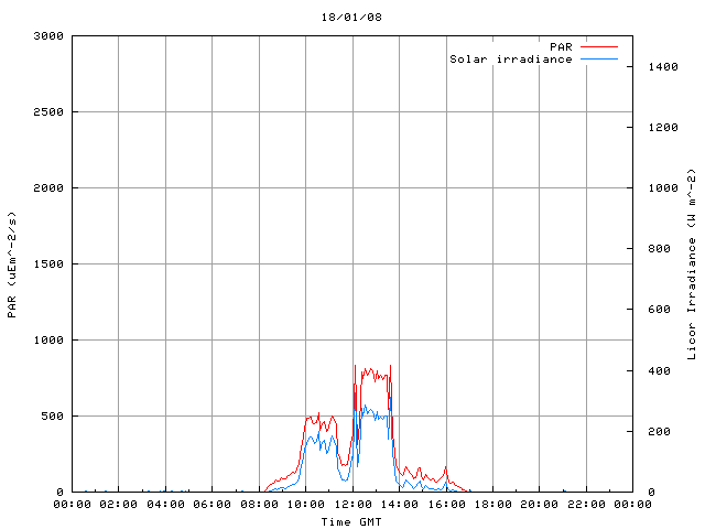 The PML meteorological station, situated on the south-west corner of the building roof, consists of a Hygroclip S3 temperature and humidity sensor housed in a radiation shield, a Mierij Meteo solid state wind sensor (MMW-005), a Chelsea instruments half-hemisphere PAR sensor, a Li-Cor pyranometer (LI-200SZ) and an Omni Instruments 6" tipping bucket raingauge (RG200). The data are logged every 5 minutes using a Pace Scientific XR5 data logger. The real-time rainfall data is likely in error - the correct values will be displayed after a time lag of approximately 24 hours. The meteorological station is sheltered from winds in the north-east and underestimates winds from this quarter. To use these data please contact Dr Tim Smyth.