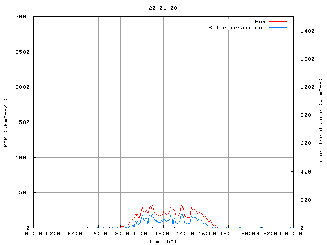 The PML meteorological station, situated on the south-west corner of the building roof, consists of a Hygroclip S3 temperature and humidity sensor housed in a radiation shield, a Mierij Meteo solid state wind sensor (MMW-005), a Chelsea instruments half-hemisphere PAR sensor, a Li-Cor pyranometer (LI-200SZ) and an Omni Instruments 6" tipping bucket raingauge (RG200). The data are logged every 5 minutes using a Pace Scientific XR5 data logger. The real-time rainfall data is likely in error - the correct values will be displayed after a time lag of approximately 24 hours. The meteorological station is sheltered from winds in the north-east and underestimates winds from this quarter. To use these data please contact Dr Tim Smyth.