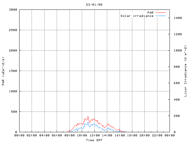 The PML meteorological station, situated on the south-west corner of the building roof, consists of a Hygroclip S3 temperature and humidity sensor housed in a radiation shield, a Mierij Meteo solid state wind sensor (MMW-005), a Chelsea instruments half-hemisphere PAR sensor, a Li-Cor pyranometer (LI-200SZ) and an Omni Instruments 6" tipping bucket raingauge (RG200). The data are logged every 5 minutes using a Pace Scientific XR5 data logger. The real-time rainfall data is likely in error - the correct values will be displayed after a time lag of approximately 24 hours. The meteorological station is sheltered from winds in the north-east and underestimates winds from this quarter. To use these data please contact Dr Tim Smyth.