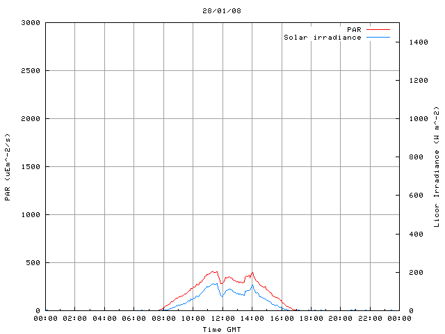 The PML meteorological station, situated on the south-west corner of the building roof, consists of a Hygroclip S3 temperature and humidity sensor housed in a radiation shield, a Mierij Meteo solid state wind sensor (MMW-005), a Chelsea instruments half-hemisphere PAR sensor, a Li-Cor pyranometer (LI-200SZ) and an Omni Instruments 6" tipping bucket raingauge (RG200). The data are logged every 5 minutes using a Pace Scientific XR5 data logger. The real-time rainfall data is likely in error - the correct values will be displayed after a time lag of approximately 24 hours. The meteorological station is sheltered from winds in the north-east and underestimates winds from this quarter. To use these data please contact Dr Tim Smyth.
