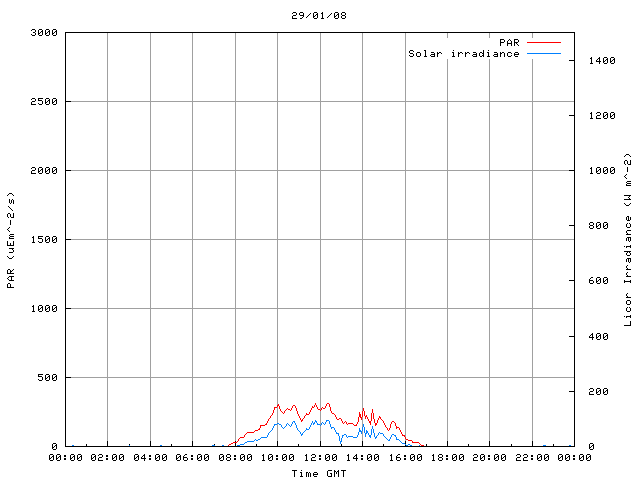 The PML meteorological station, situated on the south-west corner of the building roof, consists of a Hygroclip S3 temperature and humidity sensor housed in a radiation shield, a Mierij Meteo solid state wind sensor (MMW-005), a Chelsea instruments half-hemisphere PAR sensor, a Li-Cor pyranometer (LI-200SZ) and an Omni Instruments 6" tipping bucket raingauge (RG200). The data are logged every 5 minutes using a Pace Scientific XR5 data logger. The real-time rainfall data is likely in error - the correct values will be displayed after a time lag of approximately 24 hours. The meteorological station is sheltered from winds in the north-east and underestimates winds from this quarter. To use these data please contact Dr Tim Smyth.