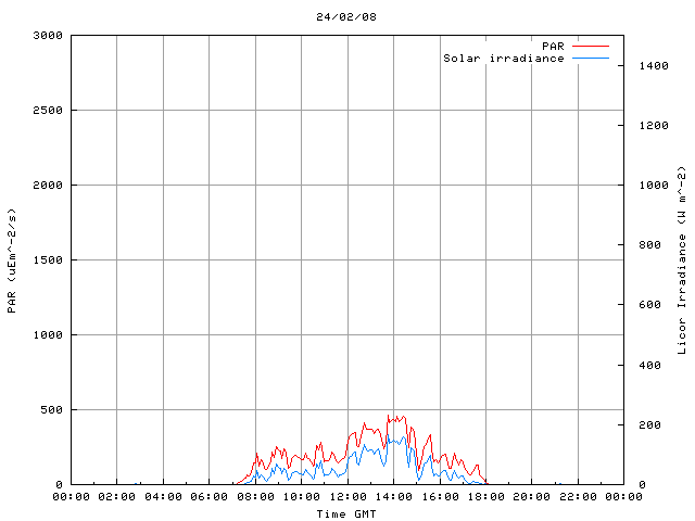 The PML meteorological station, situated on the south-west corner of the building roof, consists of a Hygroclip S3 temperature and humidity sensor housed in a radiation shield, a Mierij Meteo solid state wind sensor (MMW-005), a Chelsea instruments half-hemisphere PAR sensor, a Li-Cor pyranometer (LI-200SZ) and an Omni Instruments 6" tipping bucket raingauge (RG200). The data are logged every 5 minutes using a Pace Scientific XR5 data logger. The real-time rainfall data is likely in error - the correct values will be displayed after a time lag of approximately 24 hours. The meteorological station is sheltered from winds in the north-east and underestimates winds from this quarter. To use these data please contact Dr Tim Smyth.
