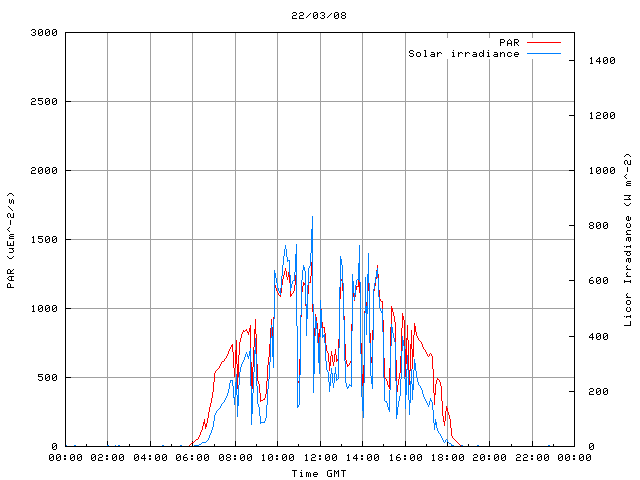 The PML meteorological station, situated on the south-west corner of the building roof, consists of a Hygroclip S3 temperature and humidity sensor housed in a radiation shield, a Mierij Meteo solid state wind sensor (MMW-005), a Chelsea instruments half-hemisphere PAR sensor, a Li-Cor pyranometer (LI-200SZ) and an Omni Instruments 6" tipping bucket raingauge (RG200). The data are logged every 5 minutes using a Pace Scientific XR5 data logger. The real-time rainfall data is likely in error - the correct values will be displayed after a time lag of approximately 24 hours. The meteorological station is sheltered from winds in the north-east and underestimates winds from this quarter. To use these data please contact Dr Tim Smyth.