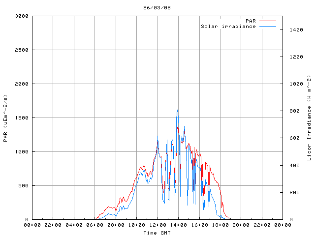The PML meteorological station, situated on the south-west corner of the building roof, consists of a Hygroclip S3 temperature and humidity sensor housed in a radiation shield, a Mierij Meteo solid state wind sensor (MMW-005), a Chelsea instruments half-hemisphere PAR sensor, a Li-Cor pyranometer (LI-200SZ) and an Omni Instruments 6" tipping bucket raingauge (RG200). The data are logged every 5 minutes using a Pace Scientific XR5 data logger. The real-time rainfall data is likely in error - the correct values will be displayed after a time lag of approximately 24 hours. The meteorological station is sheltered from winds in the north-east and underestimates winds from this quarter. To use these data please contact Dr Tim Smyth.