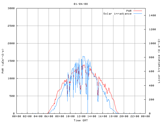 The PML meteorological station, situated on the south-west corner of the building roof, consists of a Hygroclip S3 temperature and humidity sensor housed in a radiation shield, a Mierij Meteo solid state wind sensor (MMW-005), a Chelsea instruments half-hemisphere PAR sensor, a Li-Cor pyranometer (LI-200SZ) and an Omni Instruments 6" tipping bucket raingauge (RG200). The data are logged every 5 minutes using a Pace Scientific XR5 data logger. The real-time rainfall data is likely in error - the correct values will be displayed after a time lag of approximately 24 hours. The meteorological station is sheltered from winds in the north-east and underestimates winds from this quarter. To use these data please contact Dr Tim Smyth.