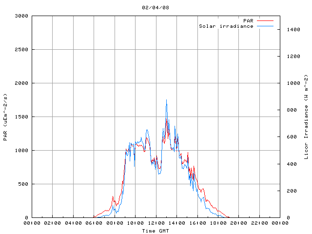 The PML meteorological station, situated on the south-west corner of the building roof, consists of a Hygroclip S3 temperature and humidity sensor housed in a radiation shield, a Mierij Meteo solid state wind sensor (MMW-005), a Chelsea instruments half-hemisphere PAR sensor, a Li-Cor pyranometer (LI-200SZ) and an Omni Instruments 6" tipping bucket raingauge (RG200). The data are logged every 5 minutes using a Pace Scientific XR5 data logger. The real-time rainfall data is likely in error - the correct values will be displayed after a time lag of approximately 24 hours. The meteorological station is sheltered from winds in the north-east and underestimates winds from this quarter. To use these data please contact Dr Tim Smyth.